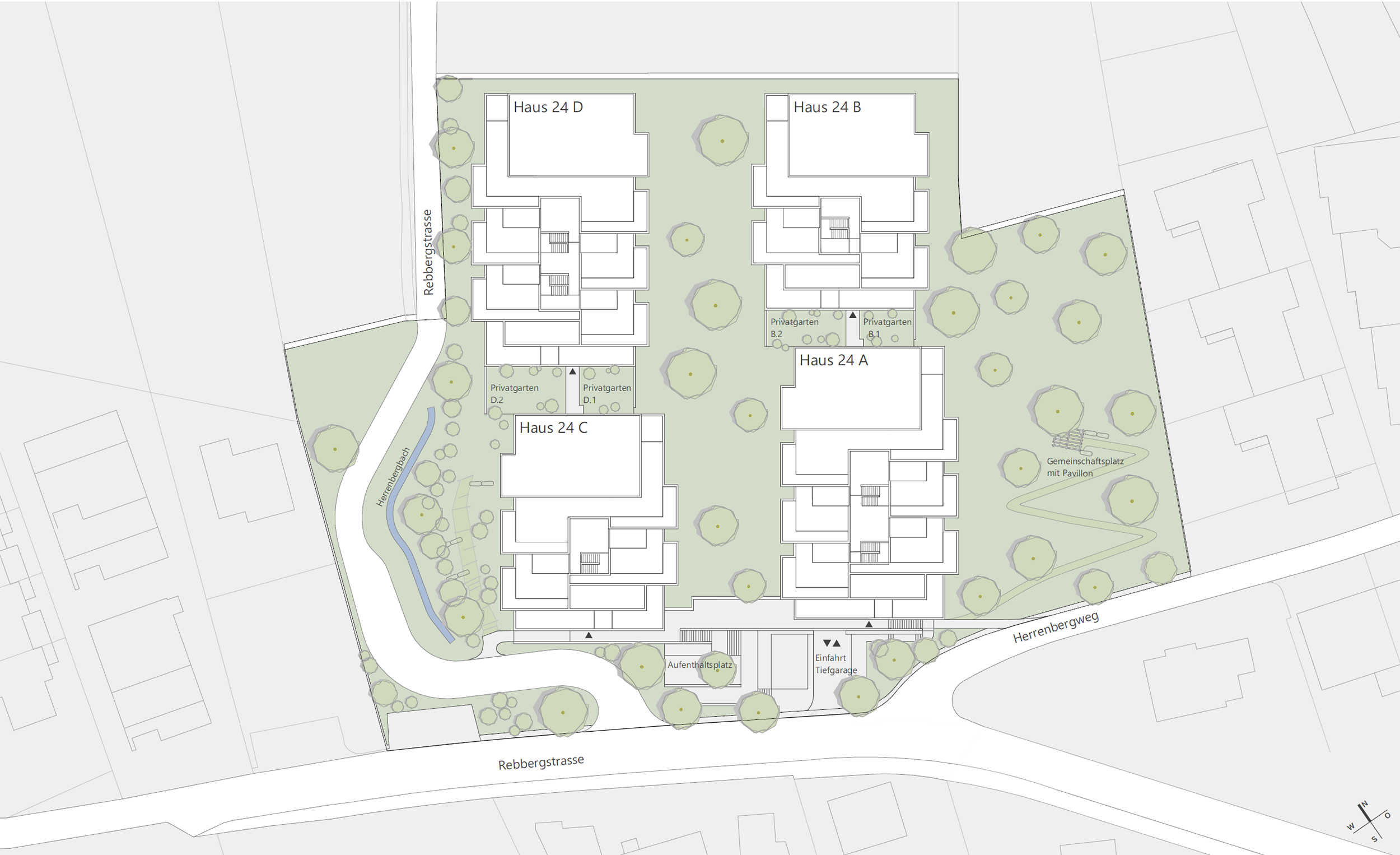 - Gemeinschaftliche Grünräume, erlebbarer Heerenbergbach und Pavillon mit Blick Richtung Sulperg.