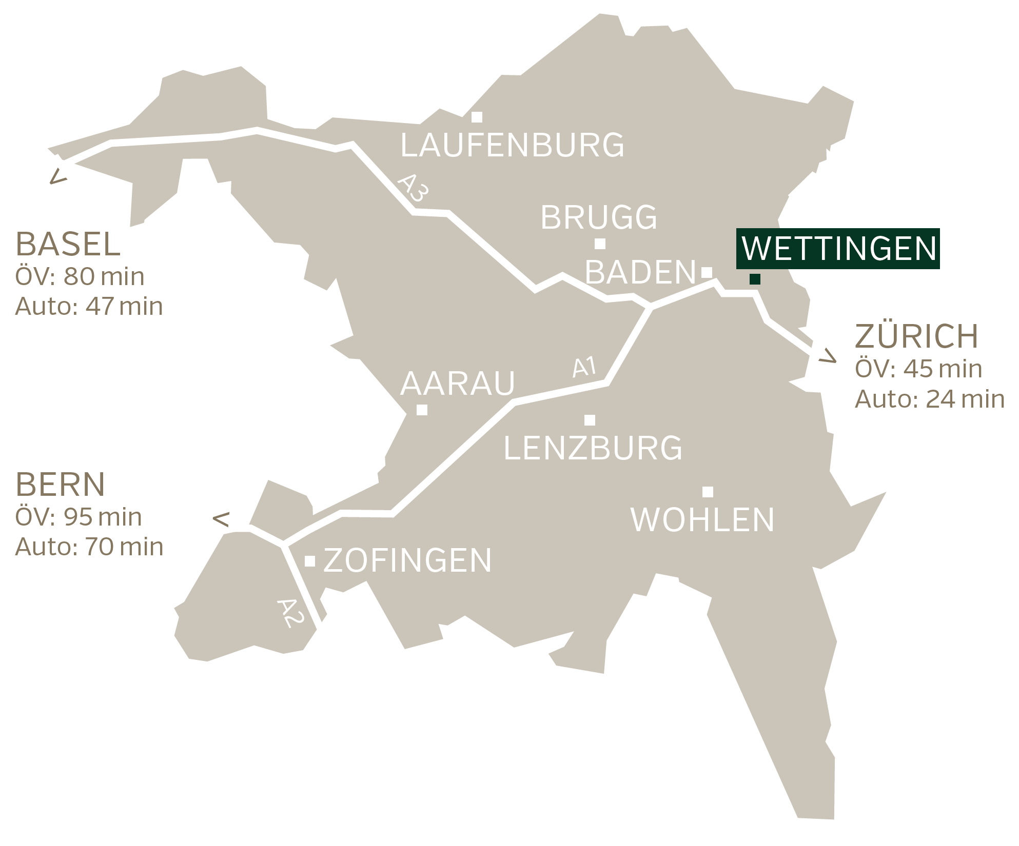 Das öffentliche Verkehrsnetz ist effizient ausgebaut. Dank der sehr guten Verbindungen sind die Städte Baden und Zürich nur einen Steinwurf entfernt. Vom Zentrum Wettingens aus fahren Busse in Richtung Sportzentrum Tägerhard, Würenlos, Neuenhof, Bahnhof Wettingen und Bahnhof Baden. Zudem ist Wettingen durch zwei Autobahnanschlüsse an die A1 in Richtung Bern/Basel und